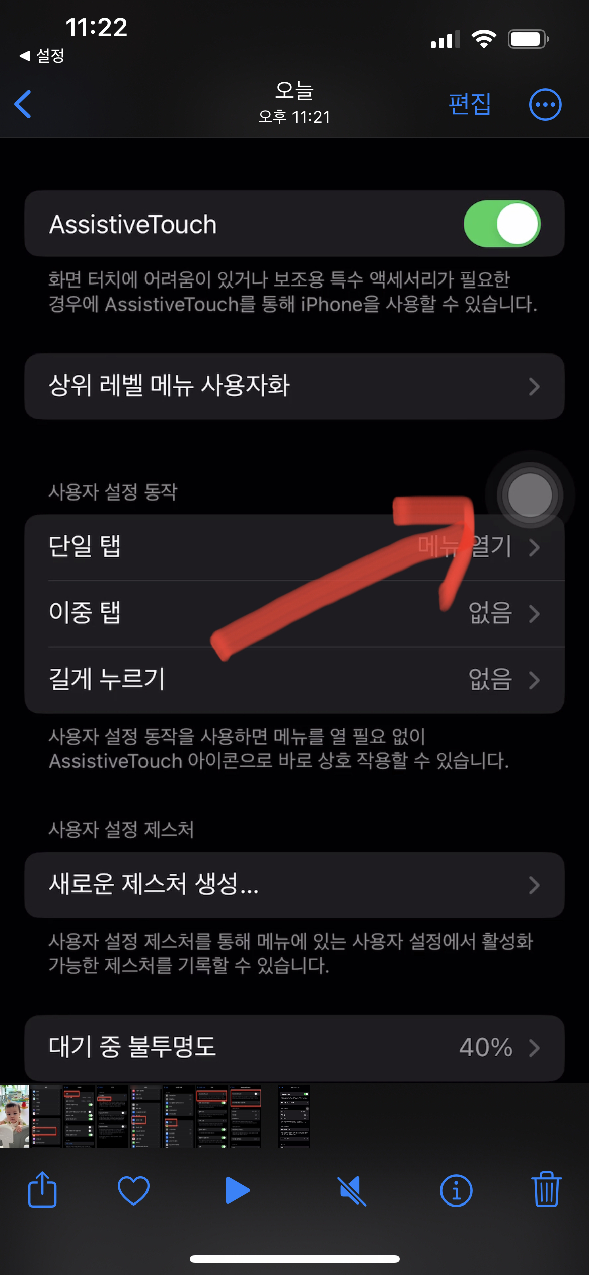 그러면 아이폰의 화면에 동그란 버튼같은게 하나 생깁니다. 이 버튼을 클릭하면 별도로 등록되어 있는 기능을 사용할 수 있게 메뉴가 확장됩니다.