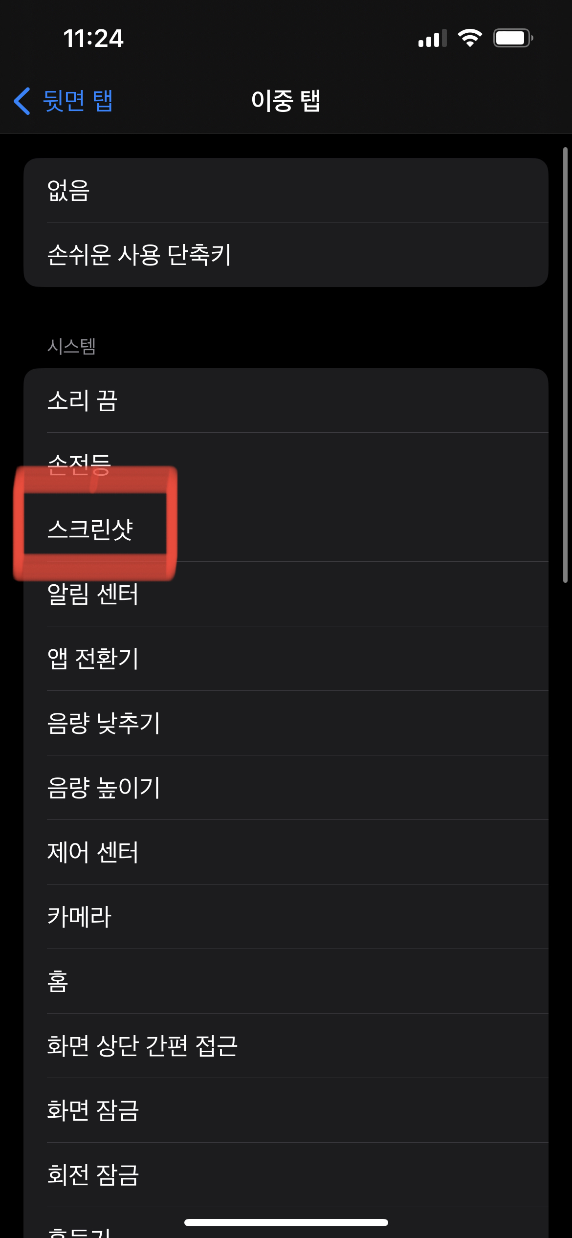 마지막으로 아이폰의 편의 기능 중 하나인 뒷면 탭 기능에 스크린샷을 연결해주는 방법입니다. iOS14부터 지원되기 시작한 뒷면 탭 기능은 아이폰을 잡은 상태에서 뒷면을 두번 혹은 세번 탭하면 특정 동작을 실행시켜주는 기능입니다.