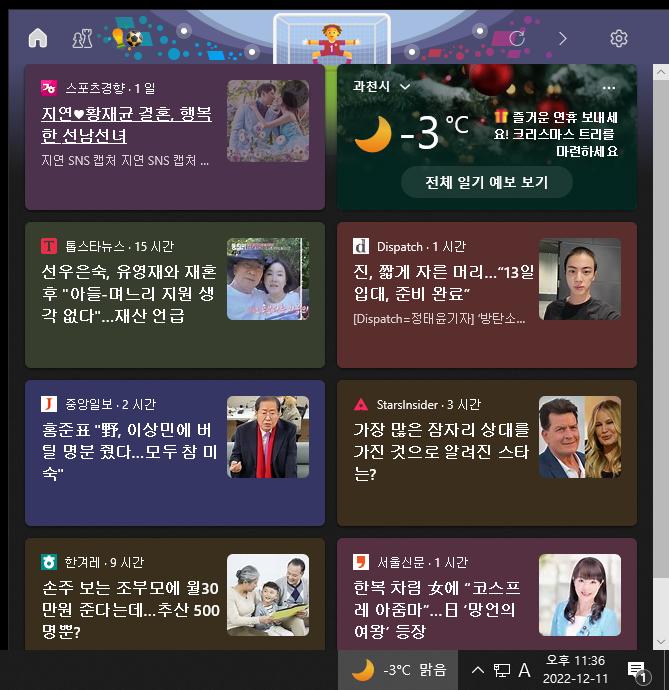 평소에 별로 사용하지 않는 기능이라서 작업표시줄의 자리만 차지하고 있다는 생각을 했는데요. 작업표시줄의 뉴스 및 날씨 표시는 윈도우의 설정으로 꺼둘 수 있습니다.