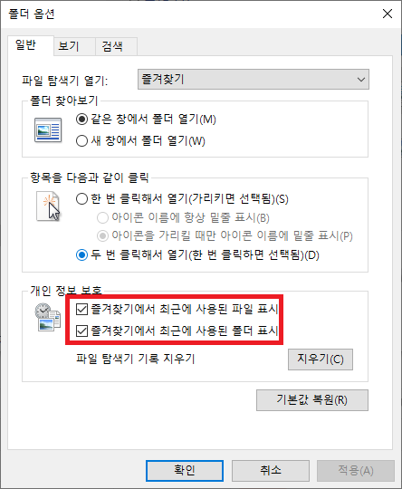 우선 '개인 정보 보호' 섹션에 있는 체크 박스 항목을 모두 해제해줍니다. 이걸 해제하지 않으면 탐색기에 최근에 사용된 파일이나 폴더가 표시됩니다. (야동을 보셨으면 여기에 걸릴 수도..)