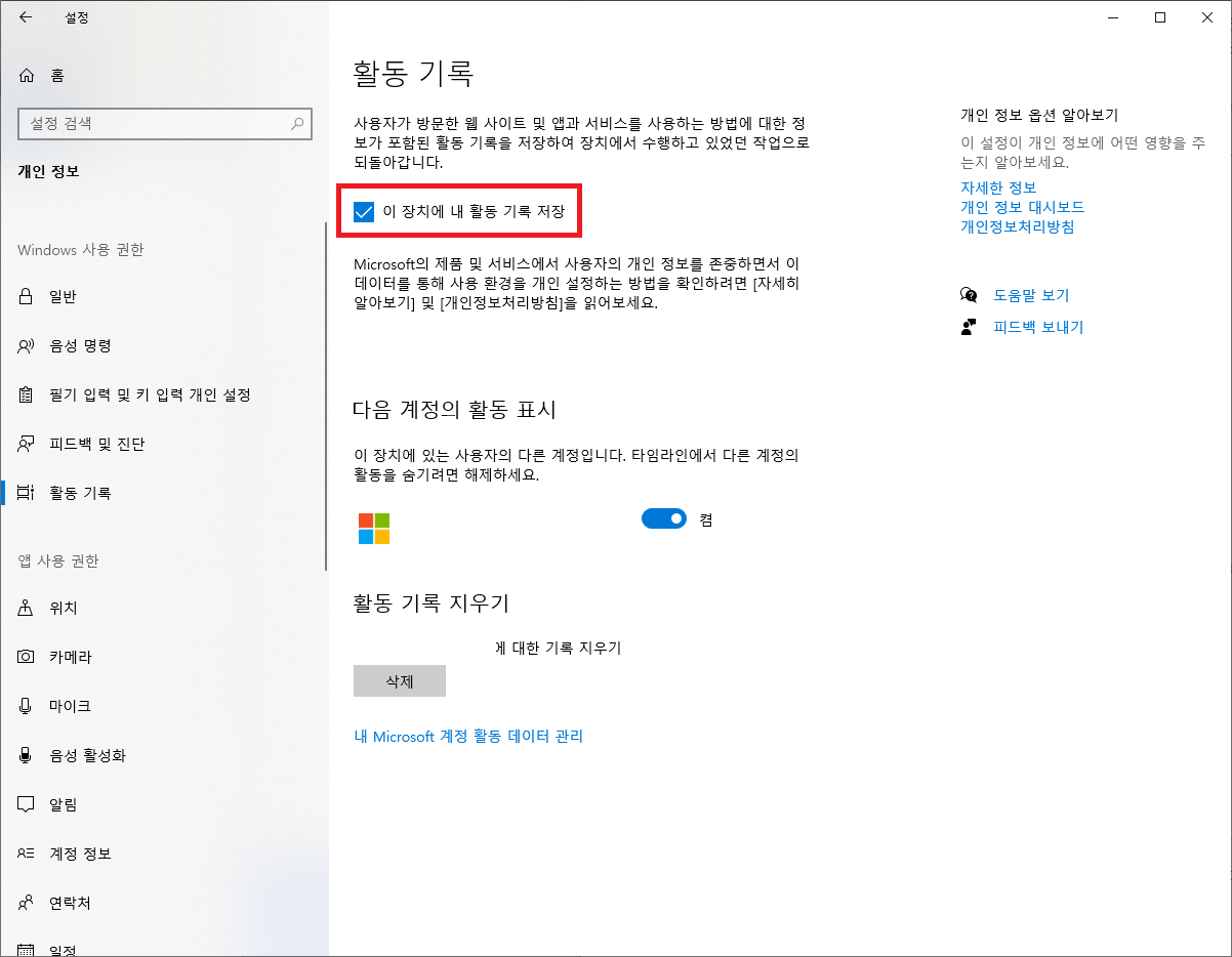 활동기록 메뉴에서 '이 장치에 내 활동 기록 저장' 항목을 해제해줍니다.