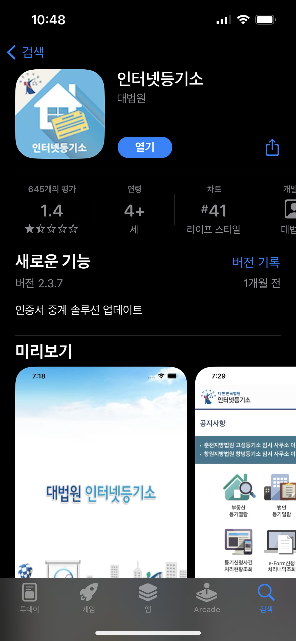 앱스토어나 플레이스토어에서 '인터넷등기소' 앱을 검색해 설치해줍니다. 설치가 완료되면 '열기'를 눌러서 앱을 실행해줍니다.
