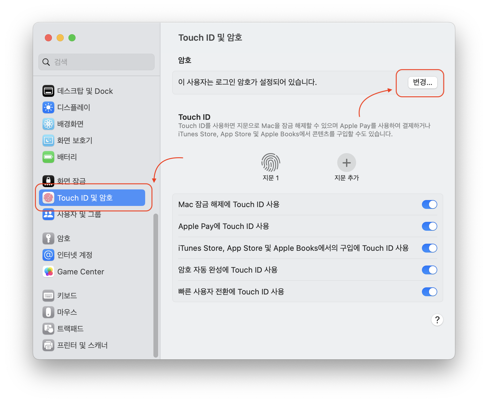 맥북의 로그인 비밀번호를 설정 앱을 통해 변경할 수 있다.