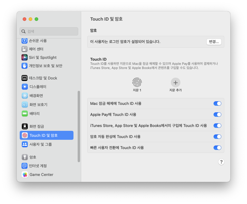 아래쪽에 있는 "Mac 잠금 해제에 Touch ID 사용" 같은 항목들을 활성화해주면 잠금 해제를 비롯한 시스템의 다양한 부분에 지문인식을 사용할 수 있다.