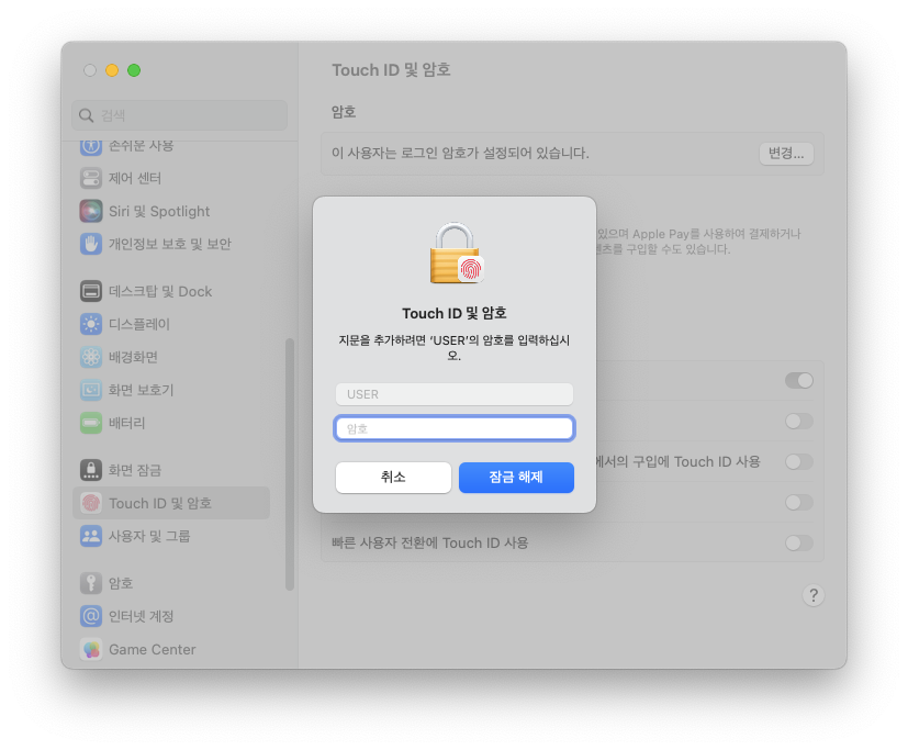 [Mac] 맥북 지문인식 (터치아이디)로 잠금해제 설정 방법
