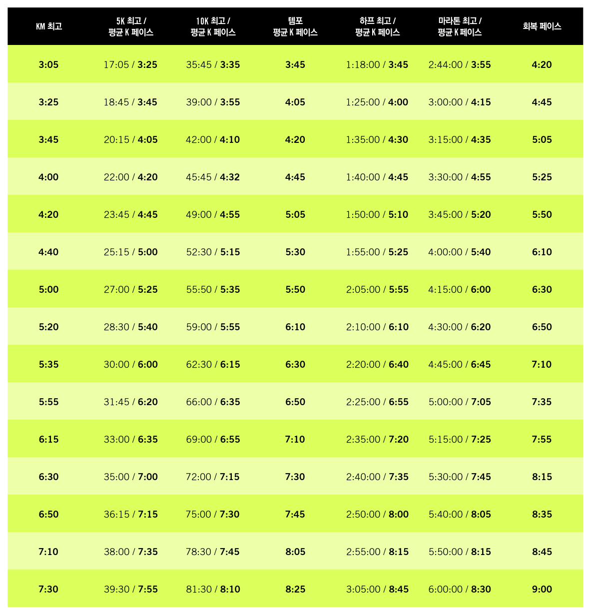 나이키에서는 페이스 차트라는 표를 제공하는데요. 페이스 차트를 통해 내 기록을 기준으로 다양한 목표를 세워볼 수 있습니다. 나이키 페이스 차트는 다음과 같습니다.